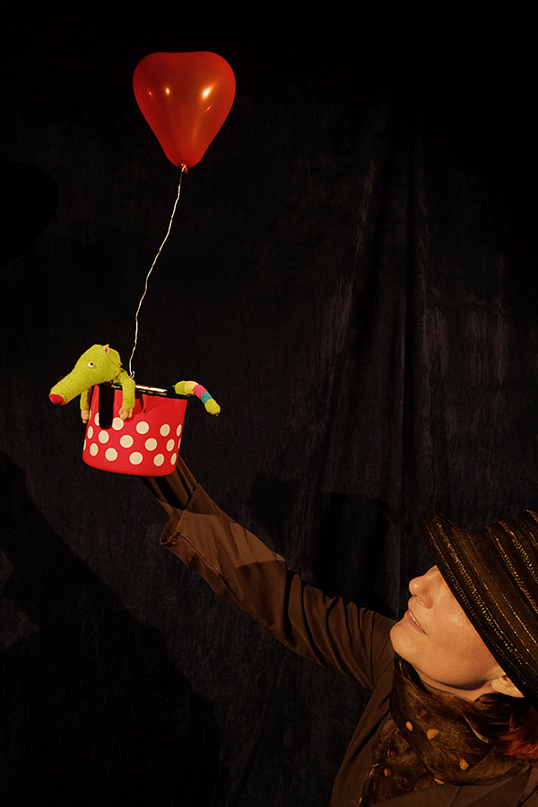 O-Ton Kinder: „Und das ist in dem Stück passiert: Ein Mann und eine Frau haben Musik gemacht und Tiersprache gesprochen… Es gab eine Maus, die wohnt in einem Koffer und hat eine Blume gehabt. Ein grüner Bär mit einer langen Nase kam in einem Topf mit einem Luftballon geflogen, aber dann kam ein Gewitter und der Bär ist abgestürzt. Dabei ist die Wäscheleine von der Maus kaputt gegangen und sie war sauer und hat geschimpft. Der Bär hat auch geschimpft und die haben gestritten. Aber dann kam der Kater und wollte die Maus fressen und da hat der Bär dann geholfen.